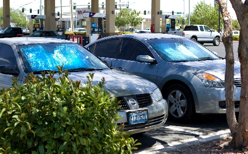 Right. Like in the huge shadow created by those wispy little desert trees? That should keep the paint on the bumper, maybe even the hood, from fading over time. A skinny palm tree? Seriously, not much shade in a Las Vegas parking lot.
