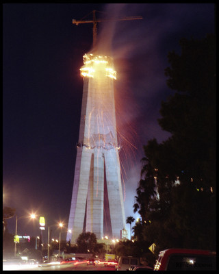 An observation deck on the under-construction Stratosphere Tower sent flames into the night sky, causing hundreds of gamblers to evacuate the adjacent Vegas World Hotel Casino.