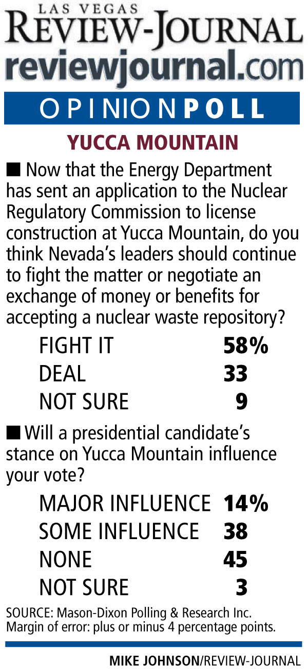 Despite the Energy Department's action this month to seek a license to build the Yucca Mountain nuclear waste repository, a Review-Journal poll has found that a majority of Nevada voters feel the same way they did four years ago: Continue to fight the project instead of making a deal in exchange for accepting it.