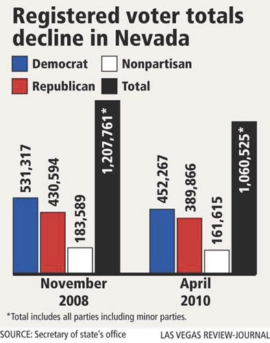 Since the end of January, the number of active registered voters in Nevada has fallen by almost 79,000. The decline since the presidential election in November 2008 has been about 147,000, or 8 percent of voters.