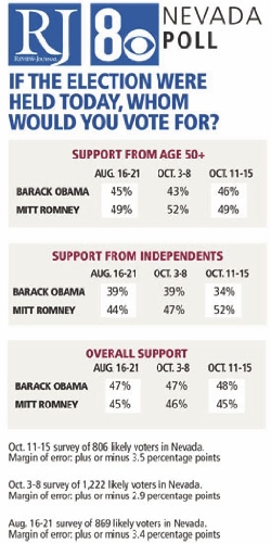 After the Oct. 3 face-off, Romney's lead among Nevada voters age 50 and older grew, giving him a nine-point advantage over Obama among that group. But the president closed the gap in the latest poll, which was taken after the Oct. 11 debate between Vice President Joe Biden and Romney's running mate, Rep. Paul Ryan, R-Wis.