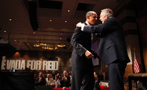 Obama praised Reid for bringing thousands of clean-energy jobs to Nevada and for backing tax cuts that helped about 1 million Nevadans, things he said will help bring back the good times.