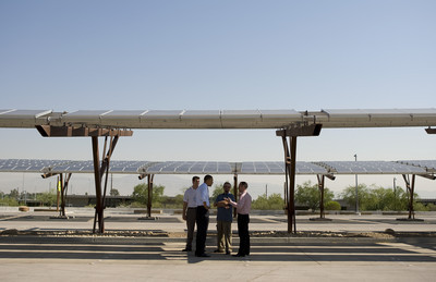 Under the bleach-bright Las Vegas summer sun, Democratic presidential candidate Barack Obama on Tuesday checked out the solar panels that shade cars in the parking lot of the Springs Preserve while powering the facility.