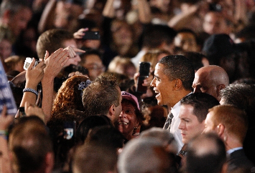 The mood was festive, even though some people waited up to six hours to see the president. Like most rallies, participants stood, cheered and waved "Vote 2010" signs.
