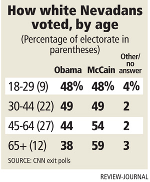 In Nevada, 48 percent of white voters 18 to 29 went for Obama, the same percentage that voted for McCain. Forty-nine percent of white voters between the age of 30 and 44 went for Obama; again McCain drew the same support in that age bracket. Forty-four percent of white voters between 45 and 64 voted for the Illinois senator.