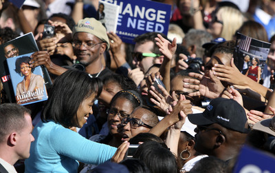 As Tsotetsi made his way through the crowd, music that ranged from George Strait's country ballads to the soulful rhythms of Earth, Wind and Fire played. Nearly 2,000 people gathered at the North Las Vegas site to hear the woman who could be first lady say that "Barack Obama will be an underdog until he's sitting in the Oval Office."