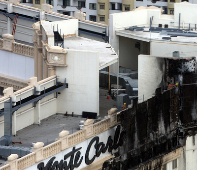 At the Monte Carlo on Thursday, workers continued repairing and cleaning the damaged areas of the hotel. The work included installation of 8-foot-by-4-foot panels to replace scorched sections of the facade.