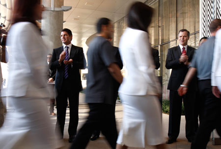 Bill McBeath, president and COO, Aria Resort, left and Jim Murren, CEO of MGM-Mirage, greet Vdara hotel staff at the opening today. This is the first hotel to open at CityCenter.