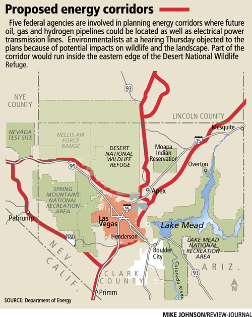 Outdoor enthusiasts and environmental advocates voiced strong opposition Thursday to a multi-agency plan to designate energy corridors through Southern Nevada where future oil, gas and hydrogen pipelines and electrical power lines will cross the Mojave Desert.