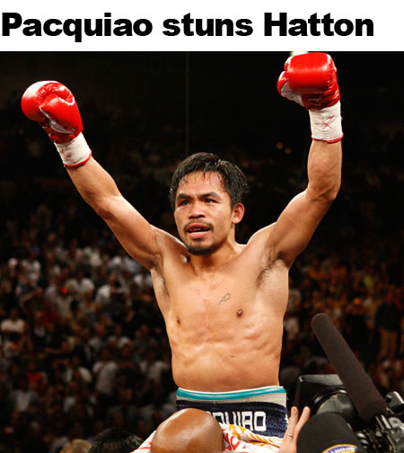 On the same day Mayweather announced his return to the ring with a July 18 fight against Juan Manuel Marquez, Pacquiao stole the undefeated former champion's thunder with a performance that was so lopsided it looked like a sparring session. The southpaw easily got away from Hatton's wild advances and just as easily hit him with punches that shouldn't come from a fighter who was fighting above 130 pounds for only the third time.