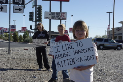 Audrey said an animal control officer visited them on the corner and lectured the children. She also said a Nye County sheriff's deputy stopped by to tell her calls were coming into the switchboard claiming what she was doing was abusive.