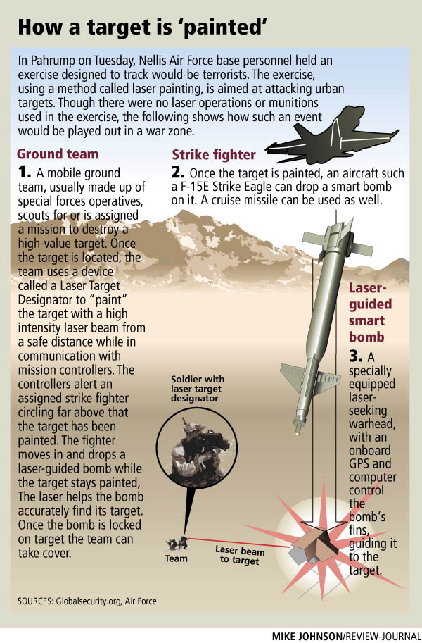 A Nellis spokeswoman did confirm, however, that flight operations were kept at a minimum 7,000 feet above ground level and the aircraft and ground crews didn't employ lasers or weapons. On the battlefield, however, lasers would be used to pinpoint the targets for the circling jets.