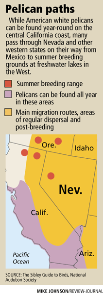 American white pelicans can fly long distances for a bird that weighs upwards of 15 pounds, traveling hundreds of miles in a stretch. And, sometimes, they do stop over at the Henderson preserve's water reclamation ponds, said John Hiatt, conservation chairman of Red Rock Audubon Society, a local chapter of the national organization.