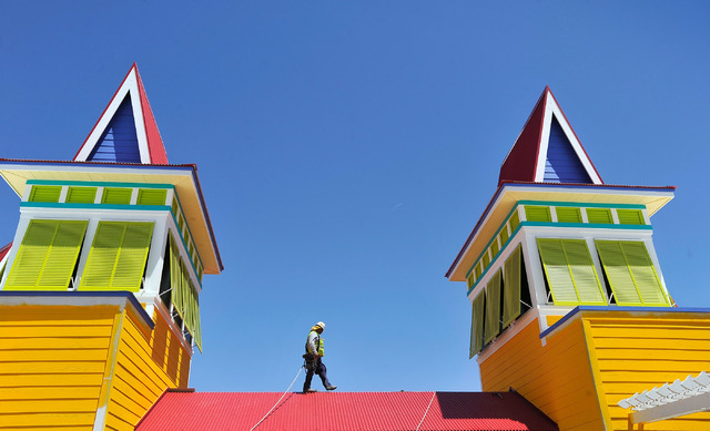 A roofer walks across the ridge line as he installs metal panels across the main entrance to the Cowabunga Bay water park in Henderson on Monday, May 12, 2014. The $25 million project is scheduled to open next month. (David Becker/Las Vegas Review-Journal)