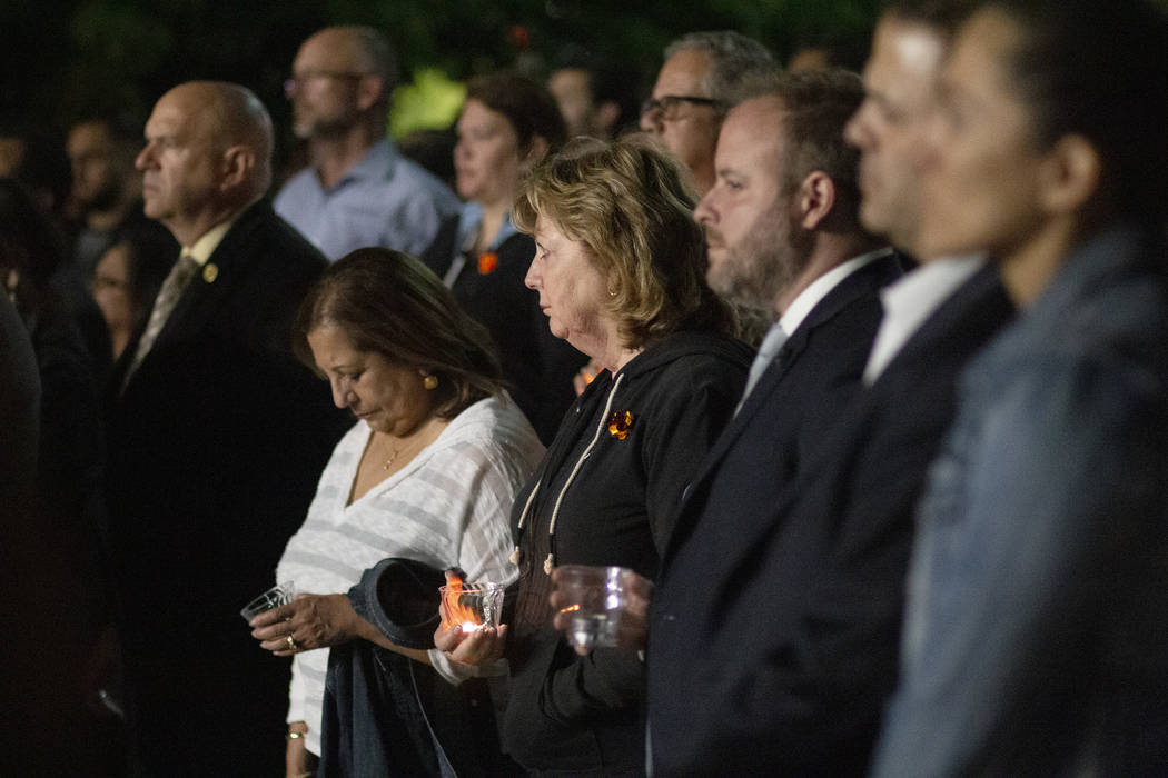 Sen. Marilyn Dondero Loop, D-Las Vegas, center, Nevada Treasurer Zach Conine, right, and Assemblywoman Sandra Jauregui, D-Las Vegas, far right, look on during a candlelight rememberance for Assemblyman Tyrone Thompson in front of the Nevada Legislature on May 7, 2019. Thompson died unexpectedly on Saturday after taking ill days earlier. (Colton Lochhead/Las Vegas Review-Journal)