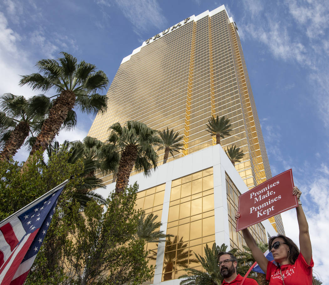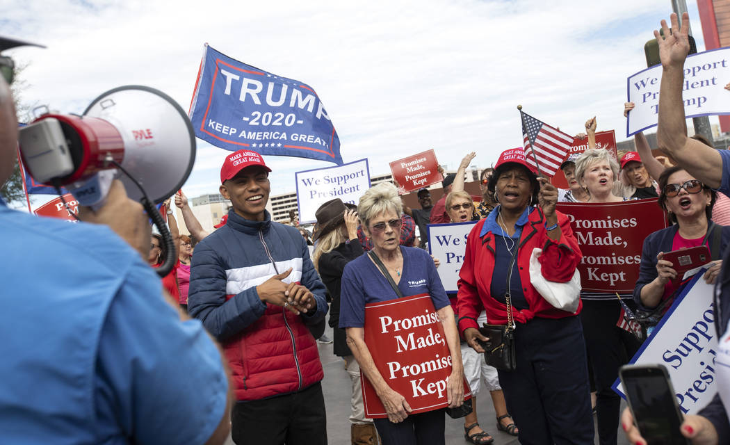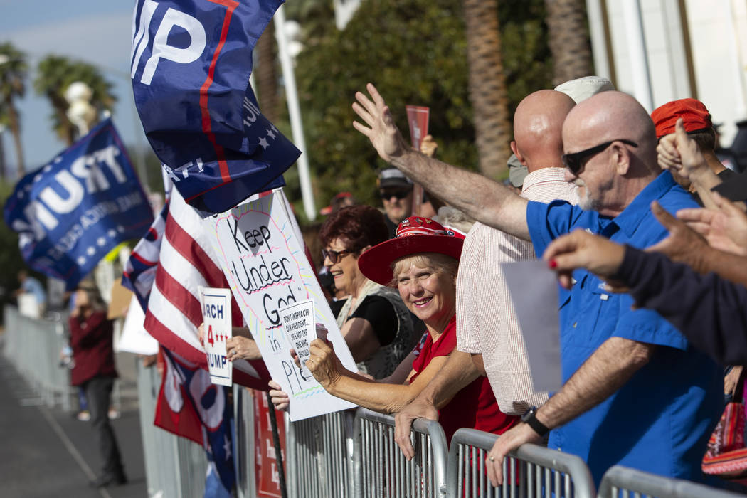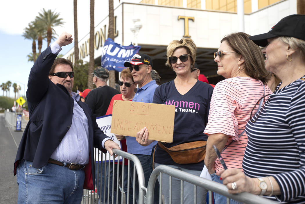 About 100 people, many carrying flags and wearing various shades of Republican red, gathered outside the Trump International in Las Vegas on Thursday to rally in support of President Donald Trump and protest the impeachment inquiry currently underway in the House of Representatives.