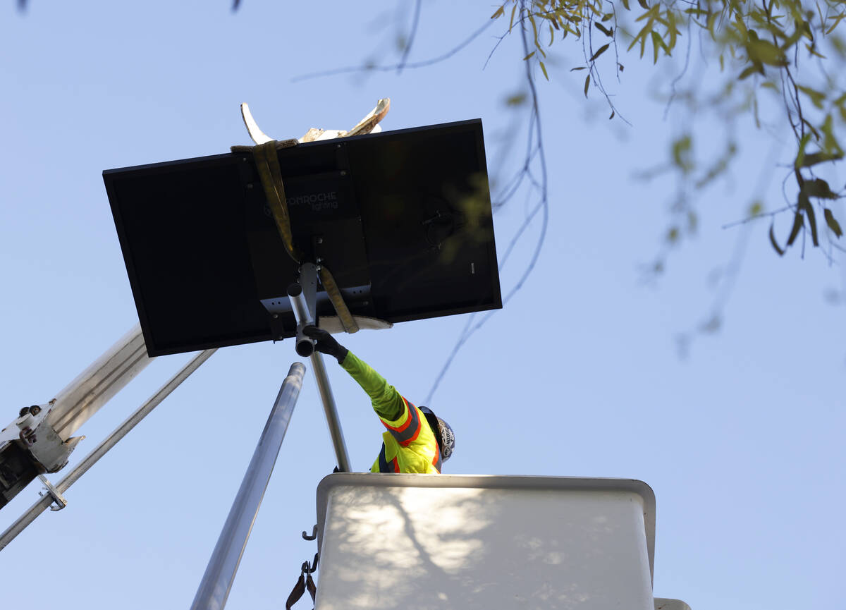 Crews began the installation of 12 solar streetlights on St. Louis Avenue, just east of Fremont Street, where streetlights along the stretch of road have been dark for months because of copper wire theft, according to Jimmy Benoit, manager of the traffic division of Clark County’s department of public works.