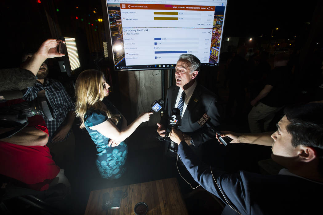 His closest opponent, retired North Las Vegas police Lt. Tim Bedwell, had nearly 16 percent of the vote. Three other candidates — Gregory Heiny, school police Detective Matt Caldwell and former Metro Detective Gordon Martines — had nearly 11 percent of the vote combined.