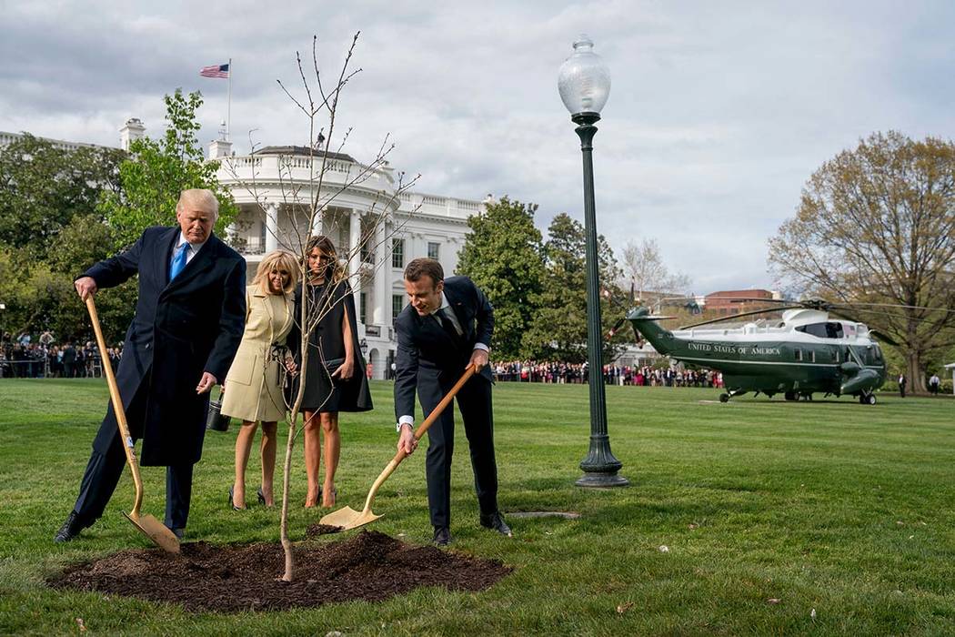 News photographers snapped away Monday when Trump and Macron shoveled dirt onto the tree during a ceremonial planting on the South Lawn. By the end of the week, the tree was gone from the lawn. A pale patch of grass was left in its place.