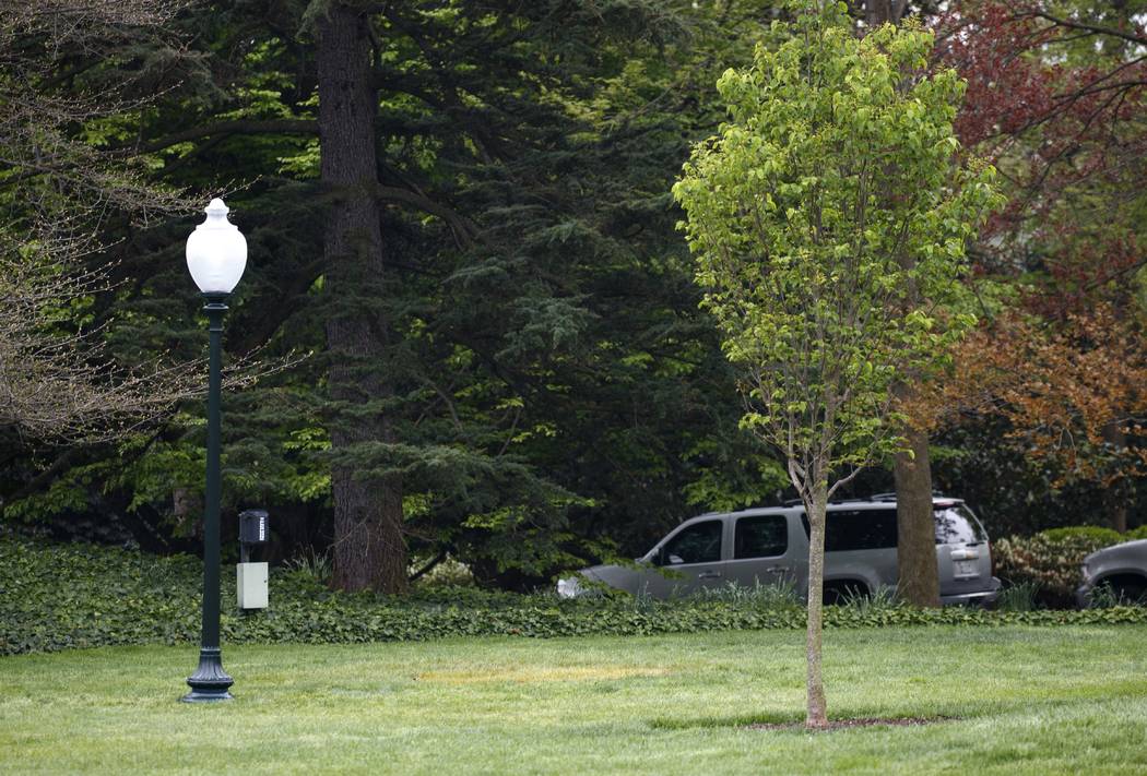 This Saturday, April 28, 2018, photo shows an empty area where a tree was planted by President Donald Trump and French President Emmanuel Macron during a tree planting ceremony is seen through the media van window on the South Lawn of the White House in Washington, Saturday, April 28, 2018. The young ceremonial tree was planted next to the light pole. (AP Photo/Carolyn Kaster)