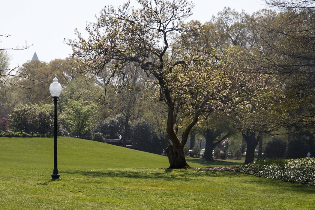 This Saturday, April 28, 2018, photo shows an empty area where a tree was planted by U.S. President Donald Trump and French President Emmanuel Macron during a tree planting ceremony on the South Lawn of the White House in Washington. The young ceremonial tree was planted in the area between the light pole at left and the tree at right. (AP Photo/Carolyn Kaster)