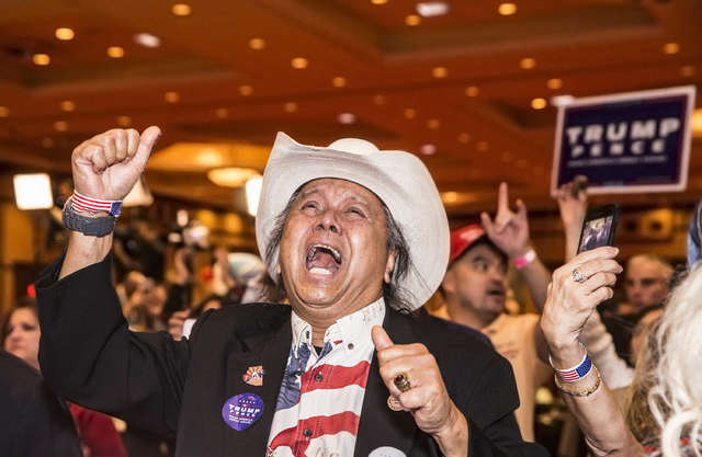 Eddie Hamilton cheers as Republican presidential nominee Donald Trump is officially announced as the 45th President of the United States at an election night event hosted by the Nevada Republican Party at South Point hotel-casino on Tues, Nov. 8, 2016, in Las Vegas. Benjamin Hager/Las Vegas Review-Journal