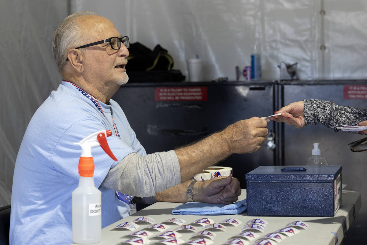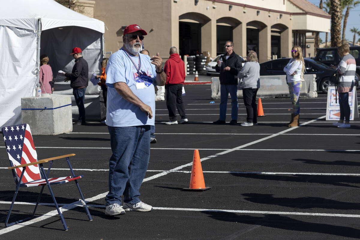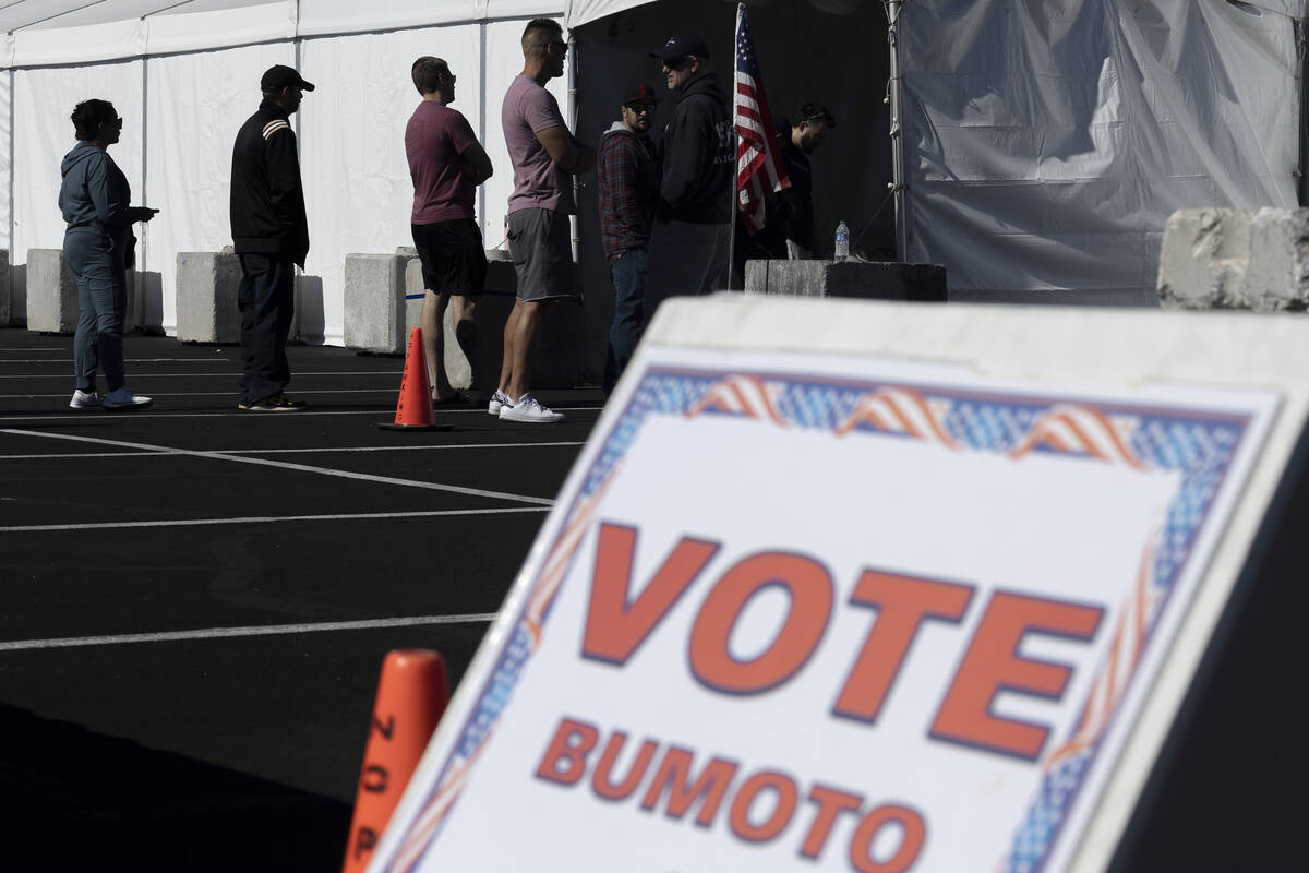 At around 7:15 p.m., the line to vote snaked around the Silverado Ranch Plaza parking lot leading into the voting center housed inside an event tent.