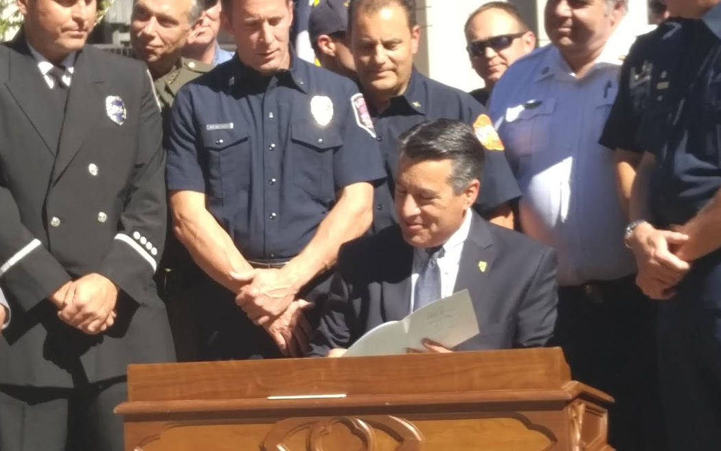 CARSON CITY — Nevada Gov. Brian Sandoval signed bills into law on Wednesday that will honor firefighters, protect first responders and start the work of studying criminal sentences.