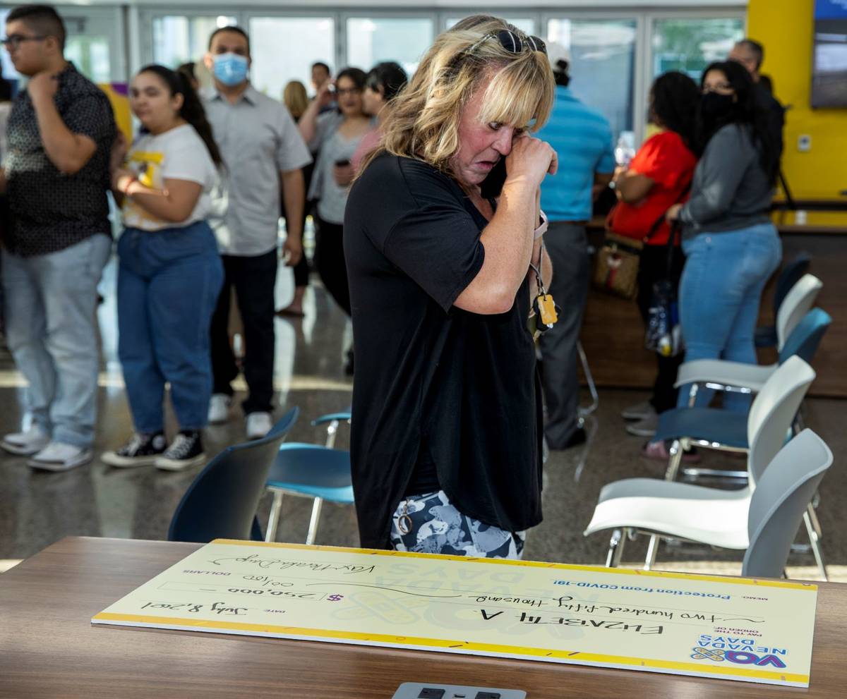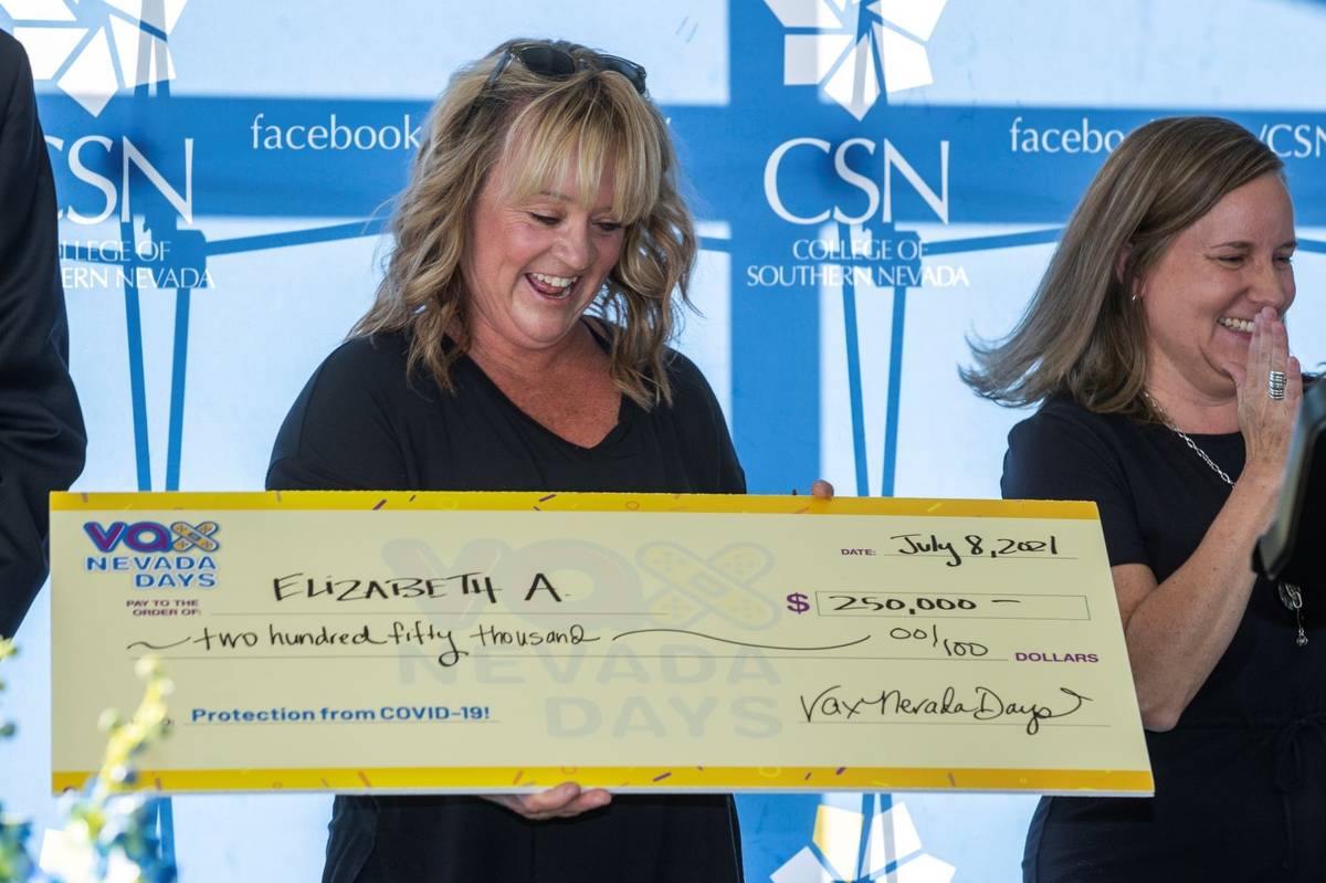 Elizabeth Allder, a teacher at Cahlan Elementary School, learned she’d won a $250,000 cash prize during a news conference where Gov. Steve Sisolak invited some of the night’s biggest winners onstage.