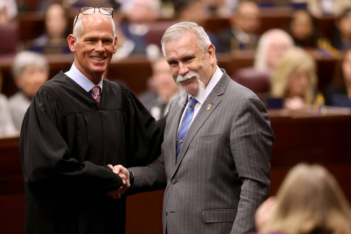 CARSON CITY – The 83rd Legislature commenced Monday with ceremonial swearing-ins, family photos and politicking in the newly renovated legislative building, with some southern Nevada lawmakers beating severe winds to arrive in Nevada’s capital.