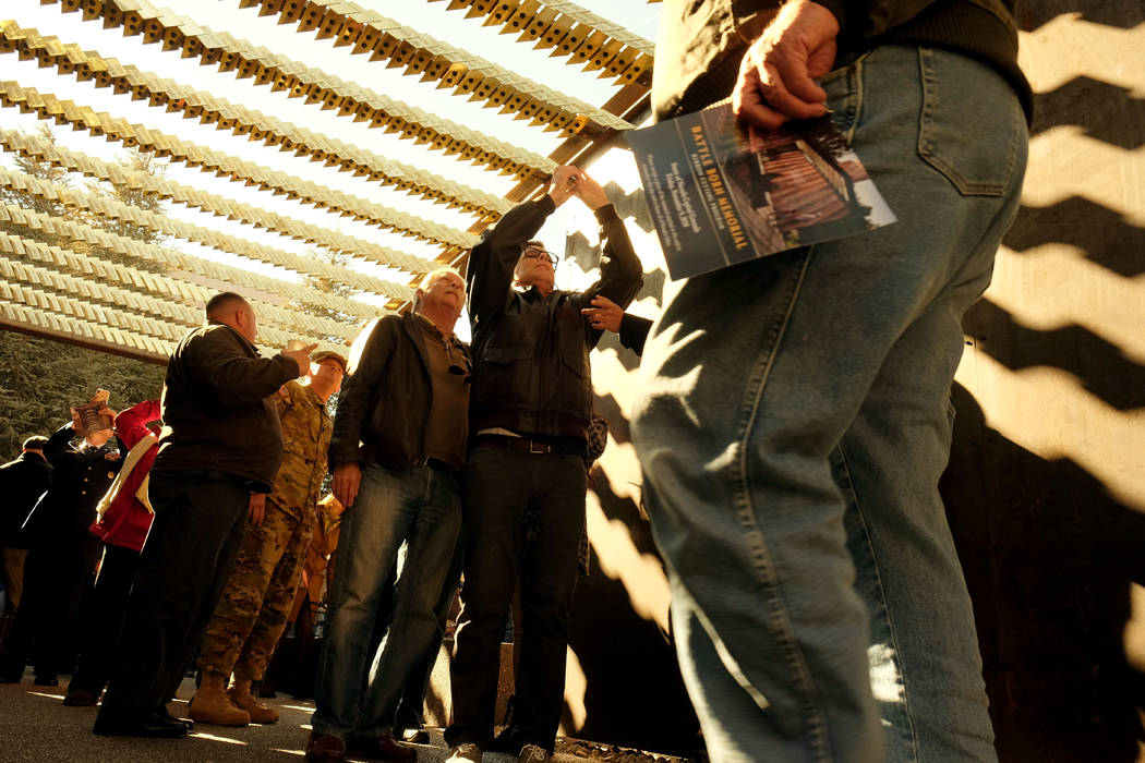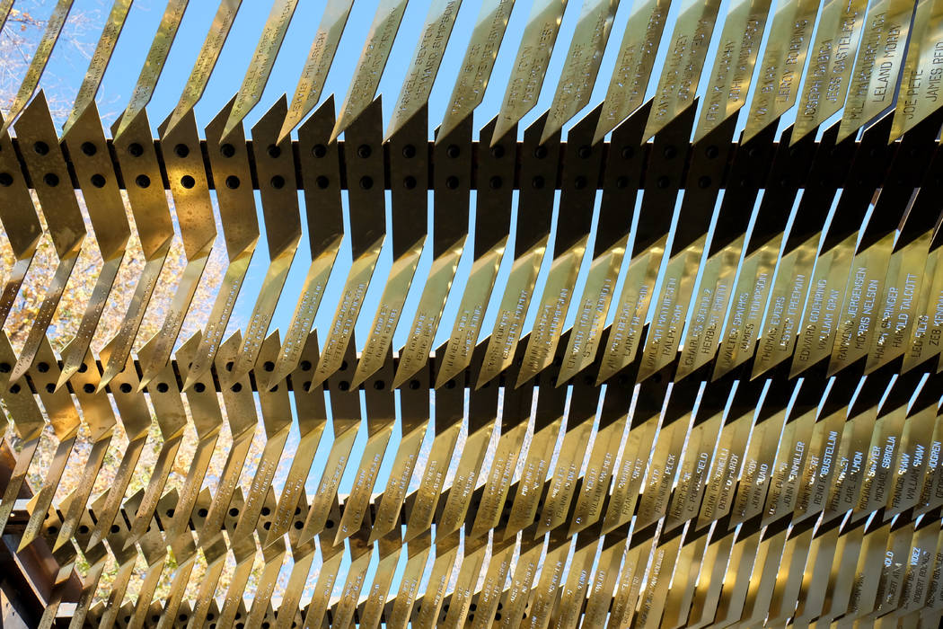 A scrim of bright, brass-colored angled metal strips with the cut-out names of fallen service members serves as shading for the structure, casting shadows of the names on its base and walls. It glistened in Friday’s brisk autumn sunshine, reflecting the nearby orange, gold and yellow of turning leaves.