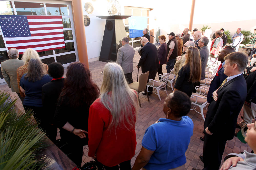 Veterans and supporters recite the Pledge of Allegiance at Veterans Village 2 in downtown Las Vegas Wednesday, Jan. 24, 2018, before a speech from Republican gubernatorial candidate Nevada Attorney General Adam Laxalt. (K.M. Cannon/Las Vegas Review-Journal) @KMCannonPhoto