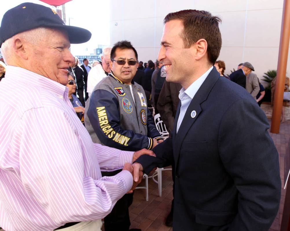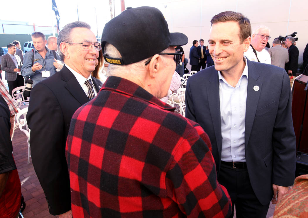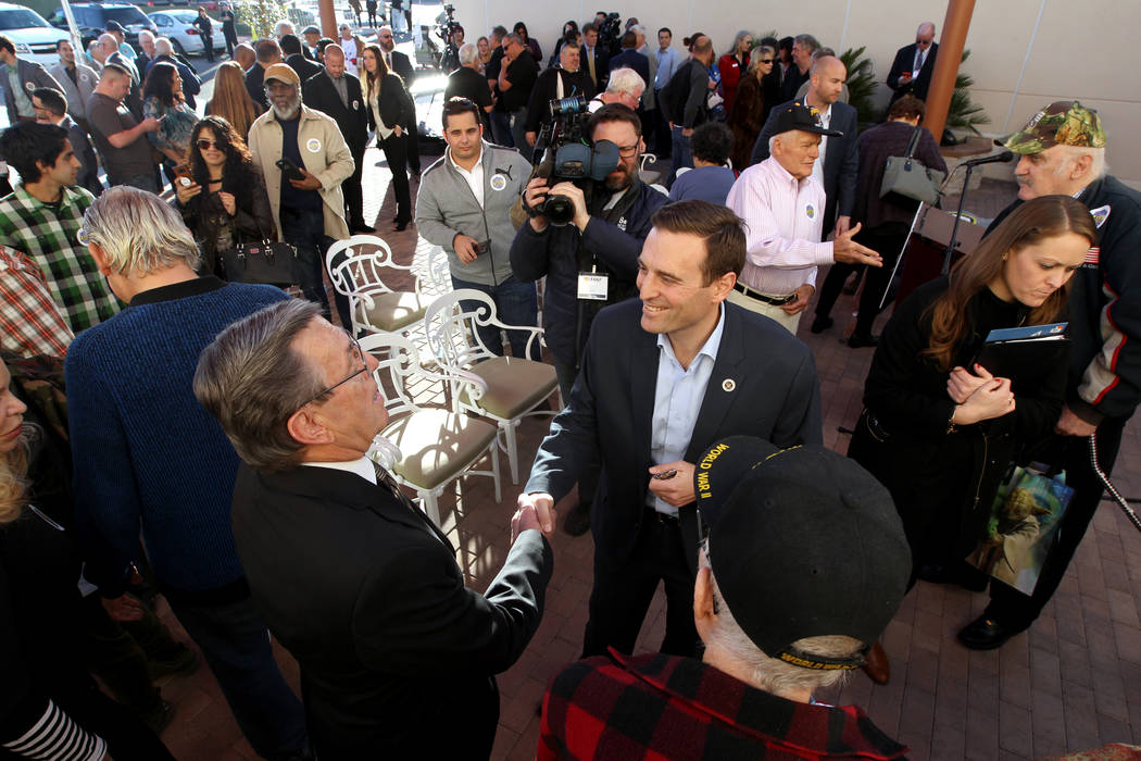 Republican gubernatorial candidate Nevada Attorney General Adam Laxalt, center, greets Bob Reed after speaking at Veterans Village in downtown Las Vegas Wednesday, Jan. 24, 2018. (K.M. Cannon/Las Vegas Review-Journal) @KMCannonPhoto