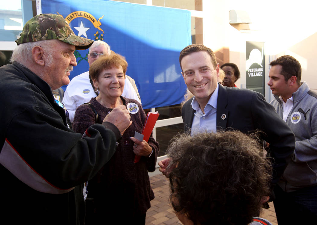 Republican gubernatorial candidate Nevada Attorney General Adam Laxalt, right, greets Glenn Noll, left, and Barbara Rodgick after speaking at Veterans Village in downtown Las Vegas Wednesday, Jan. 24, 2018. (K.M. Cannon/Las Vegas Review-Journal) @KMCannonPhoto