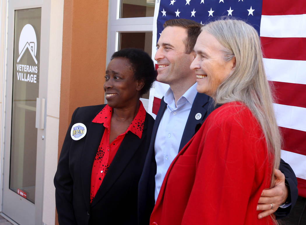 Republican gubernatorial candidate Nevada Attorney General Adam Laxalt, center, poses with Sandra Scott, left, and Dixie Thompson after speaking at Veterans Village in downtown Las Vegas Wednesday, Jan. 24, 2018. (K.M. Cannon/Las Vegas Review-Journal) @KMCannonPhoto