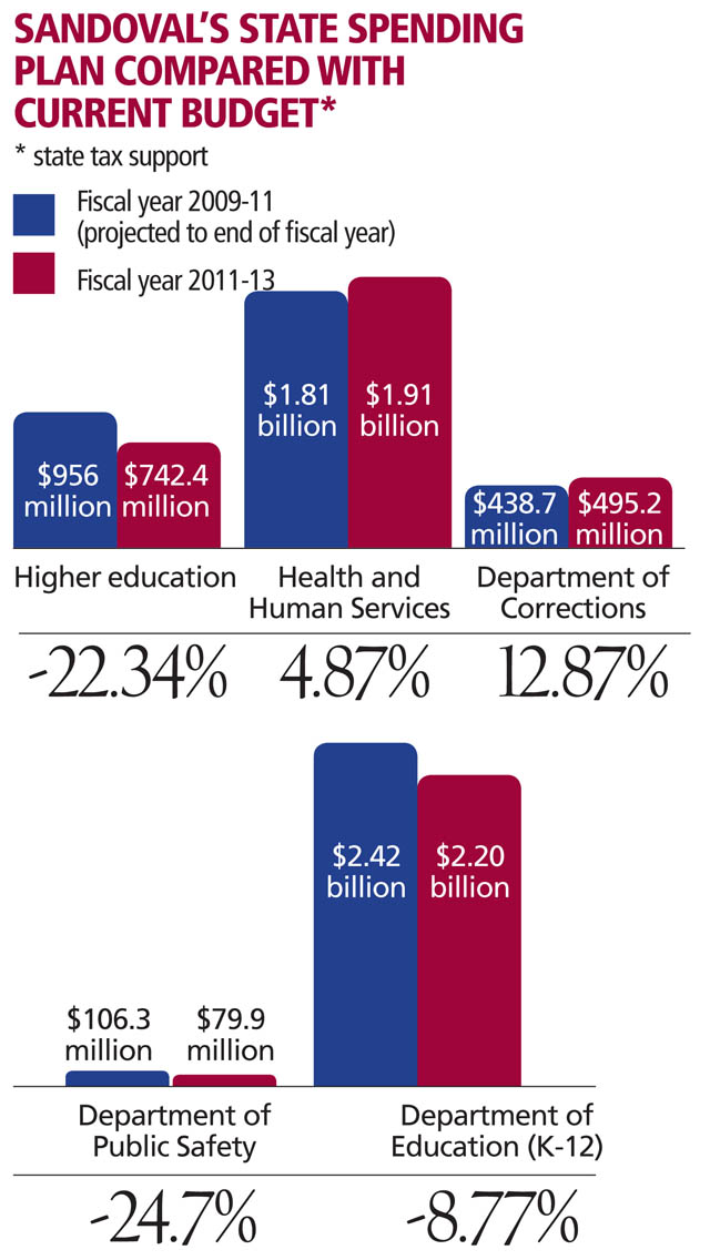 Sandoval proposed a budget plan for 2011-13 that sets the state back to 2007 spending levels, submitting a general fund budget of $5.8 billion, or 6.4 percent less than current spending -- not as deeply cut as feared by critics.