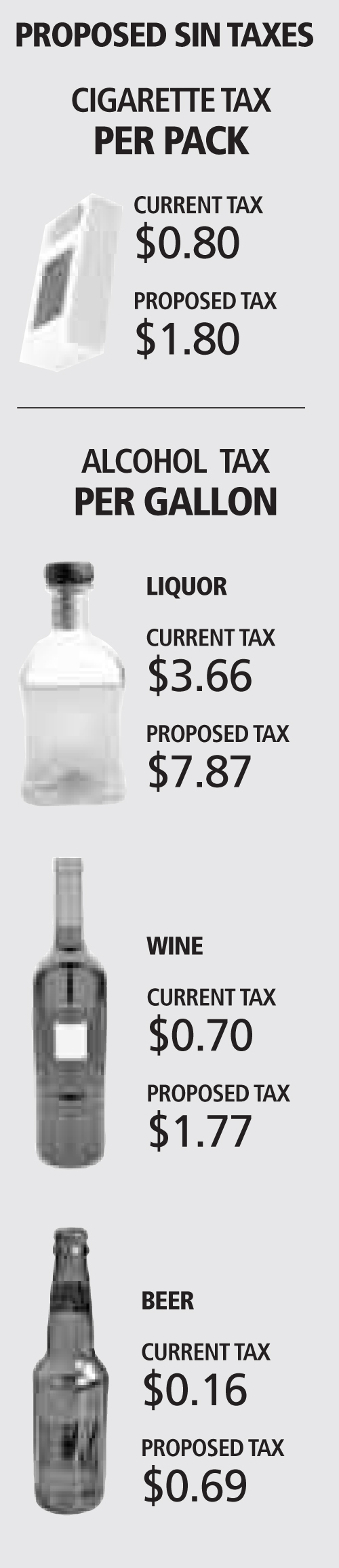 Taxes on a gallon of beer would jump to 69 cents per gallon, compared to 16 cents.