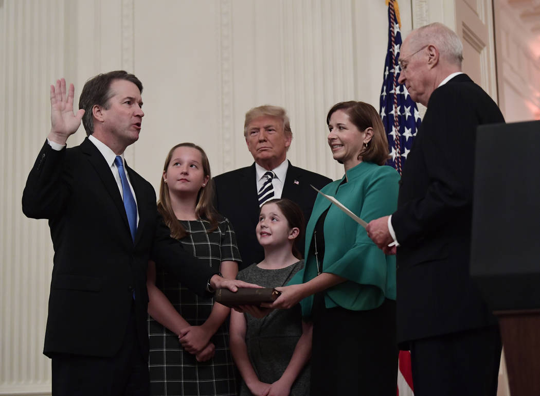 Former Justice Anthony Kennedy swore in Kavanaugh as his wife Ashley and daughters Margaret and Liza stood by him. Trump stood beaming with the Kavanaughs in a ceremony that was over in half an hour.