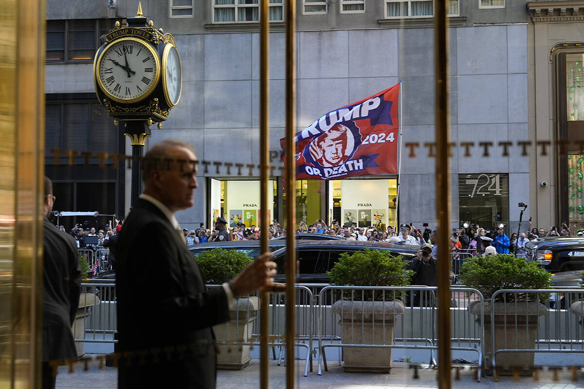 Outside, on Manhattan’s Fifth Avenue, supporters gathered across the street flew a giant red “TRUMP OR DEATH” sign that flapped in front of a high-end boutique. A small group of protesters held up signs that said “Guilty” and “Justice matters.”