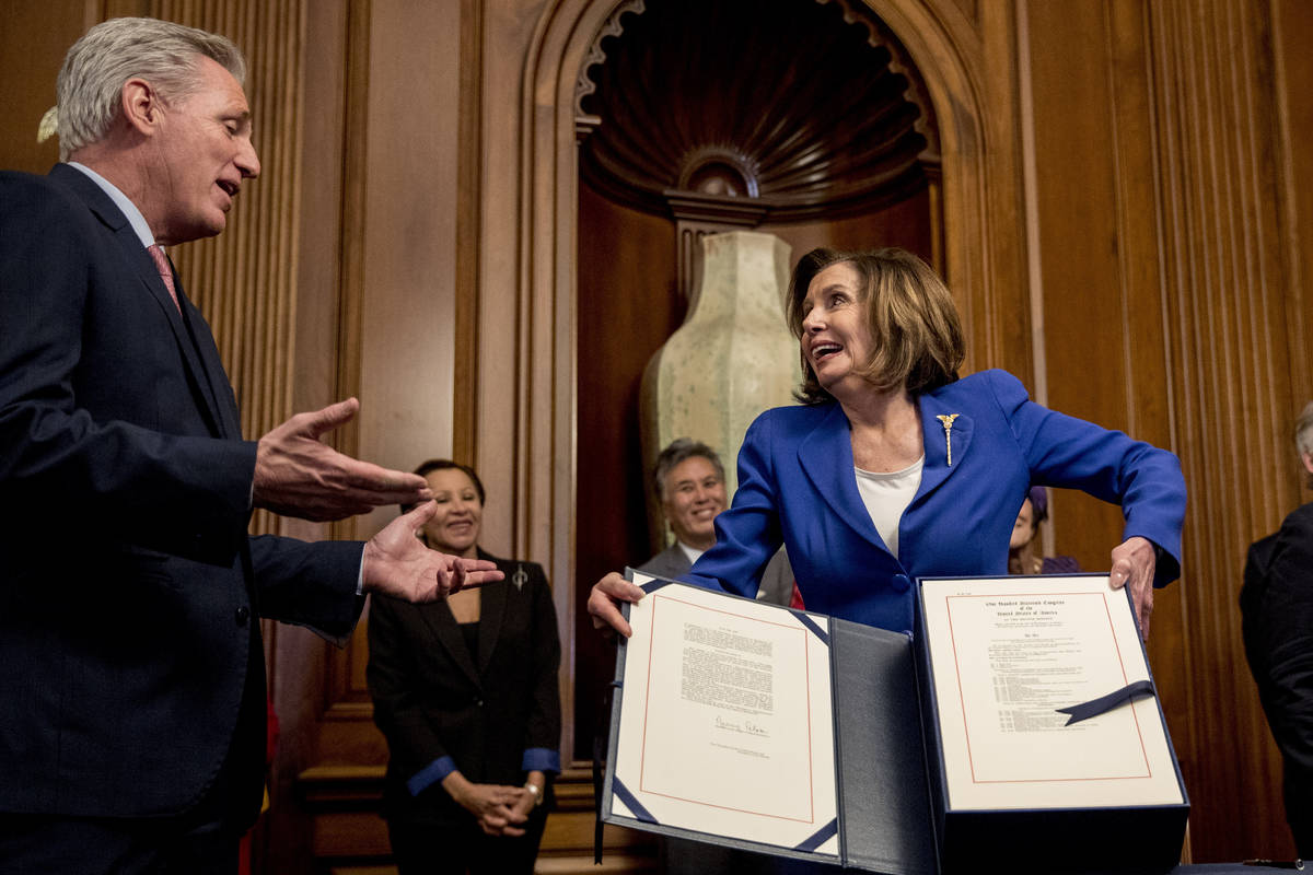 Below, House Speaker Nancy Pelosi, D-Calif., and Minority Leader Kevin McCarthy, R-Calif., spoke of bipartisan cooperation to put together the massive package of aid.