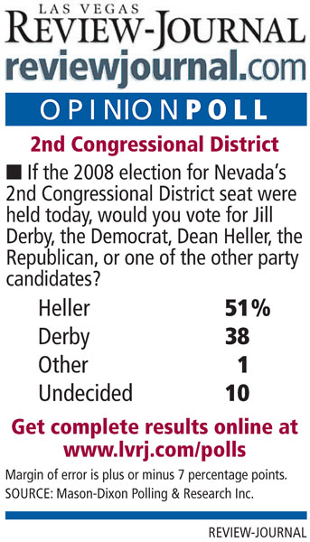 CARSON CITY — Rep. Dean Heller, R-Nev., holds a commanding 13 percentage point lead over former state Democratic Party chairwoman Jill Derby in their rematch for the 2nd Congressional District seat, according to a new poll commissioned by the Review-Journal.