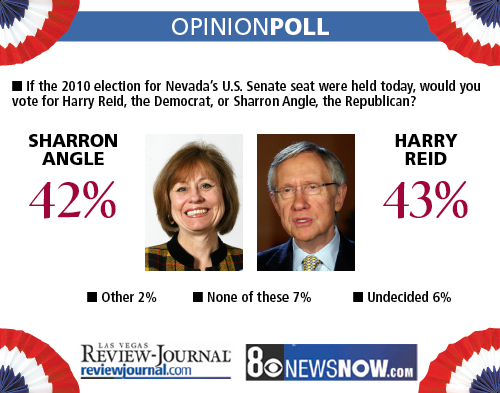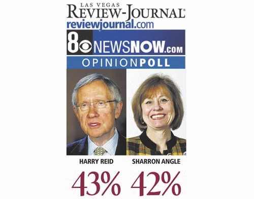 The new survey by Mason-Dixon Polling & Research shows Reid and Angle neck and neck. The Senate majority leader would win 43 percent and Angle 42 percent of support from likely Nevada voters if the election were held now. The margin of error is plus or minus 4 percentage points on the statewide telephone survey of 625 registered voters taken Monday through Wednesday.