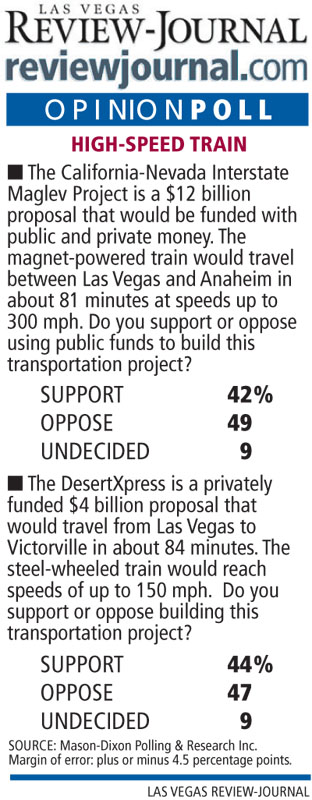 A poll conducted Tuesday through Thursday by Washington D.C.-based Mason-Dixon Polling & Research, Inc. showed that of 500 registered voters throughout the state, 42 percent supported the maglev train, which would ferry passengers from Las Vegas to Anaheim, Calif. Opponents made up 49 percent of those polled and 9 percent were undecided.
