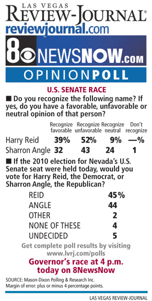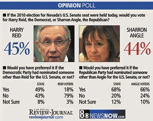 Reid and Angle have been running neck and neck for a month, according to several Mason-Dixon polls. In the latest survey of likely Nevada voters, Reid got 45 percent support compared with 44 percent for Angle, a statistical tie. The margin of error is plus or minus 4 percentage points.