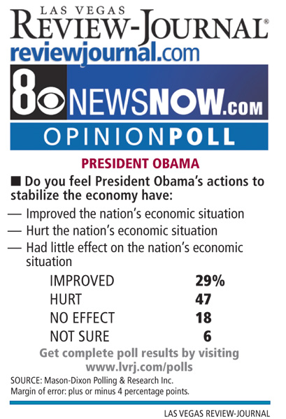 Forty-seven percent of Nevadans surveyed said President Barack Obama’s actions to stabilize the economy have hurt the nation’s economic situation, compared with 29 percent who said it has improved things.