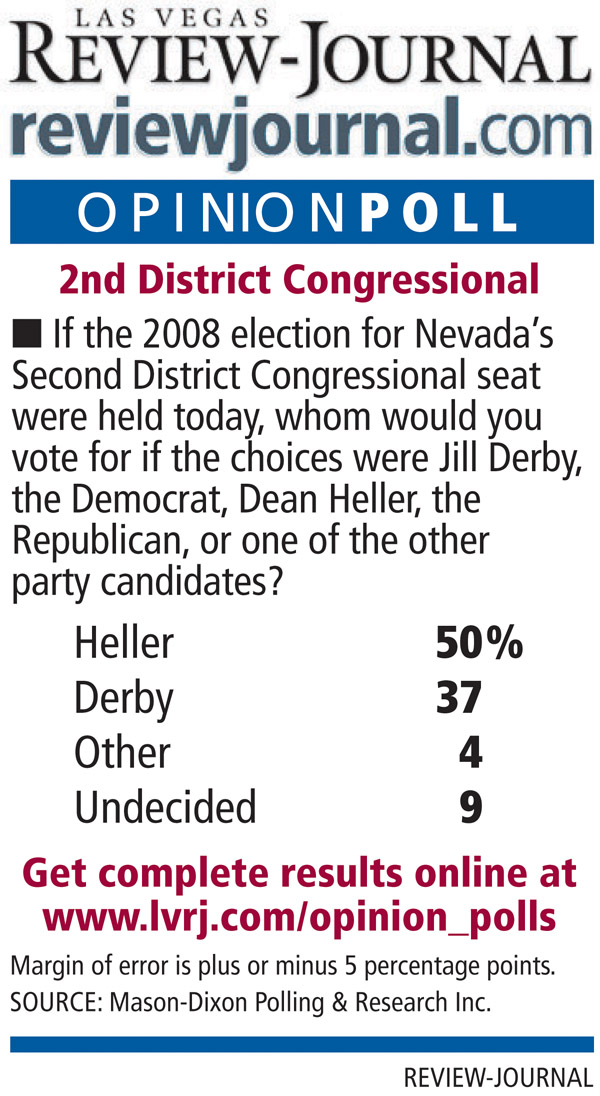 In a separate poll, Mason-Dixon found Rep. Dean Heller, R-Nev., was maintaining his commanding 13 percentage point lead over Democratic challenger Jill Derby in the 2nd Congressional District race.
