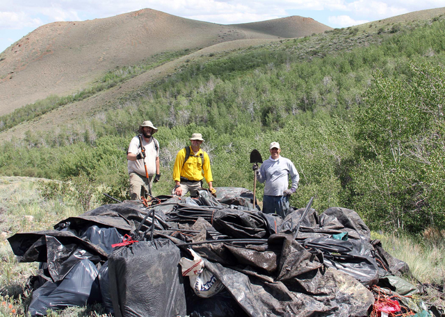 The volunteers spent 12 hours rounding up the garbage along with the black irrigation tubing, overhead wires strung between aspen trees and other equipment. On Thursday, a BLM helicopter crew airlifted the refuse out of the camp in a creek drainage near Stormy Peak, part of the mountain range about 350 miles northeast of Reno.