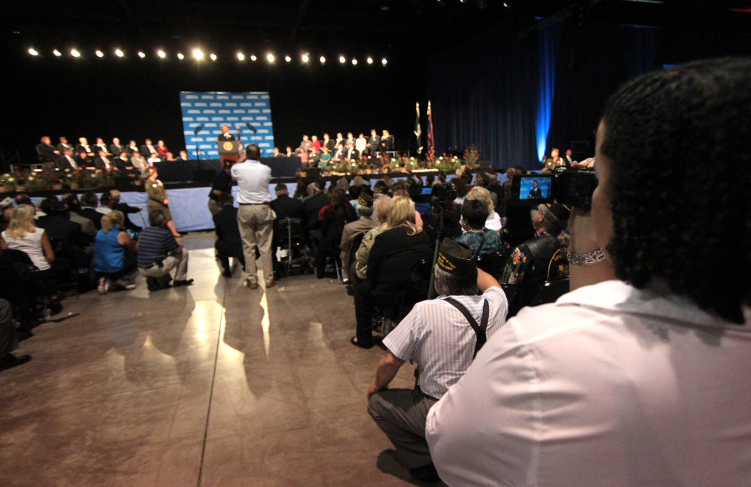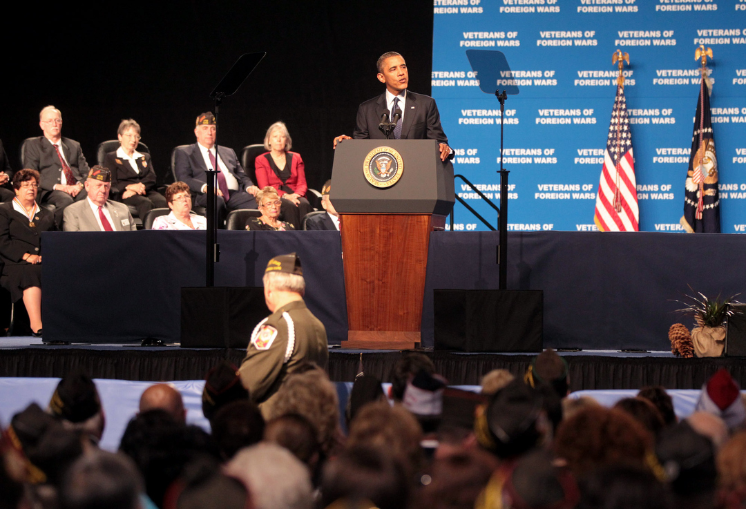 "We're going to set up a reverse boot camp," President Barack Obama said, addressing the annual convention of Veterans of Foreign Wars on Monday at the Reno-Sparks Convention Center. He said it would provide job training, education and help starting new business for veterans in order to step up their "career readiness."
