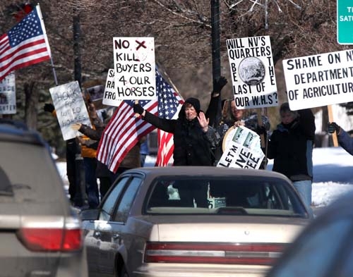 CARSON CITY – About 40 sign-carrying wild horse advocates marched Friday in front of the Legislative Building in a move to induce Gov. Brian Sandoval to block a Feb. 9 auction of 41 state-owned stray horses.