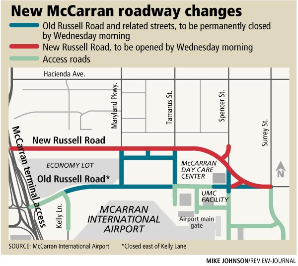 Commuters heading to facilities on the airport's east side -- including the McCarran day care center, a University Medical Center branch, the Gate Gourmet food service center -- will need to turn onto a southbound access road off of old Russell at Surrey Street between Spencer and Eastern to reach those places.